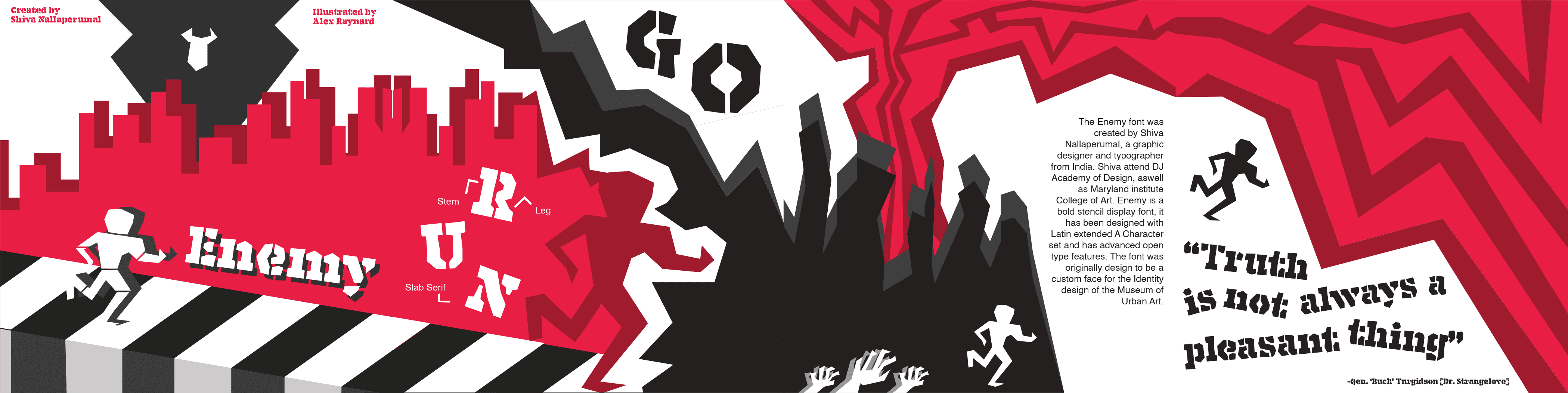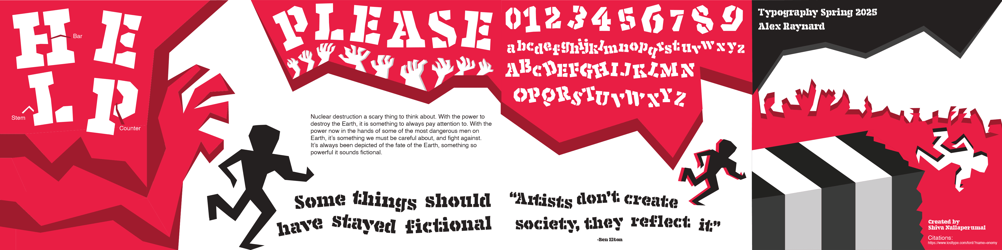 For this project, the goal was to create an 8-page typographic book and poster based on a single typeface. The typeface chosen was ‘Enemy’. The design was built around the typeface because I had never used a stencil typeface before and wanted to challenge myself creatively. The project started by researching and sketching different ideas to solve this challenge.