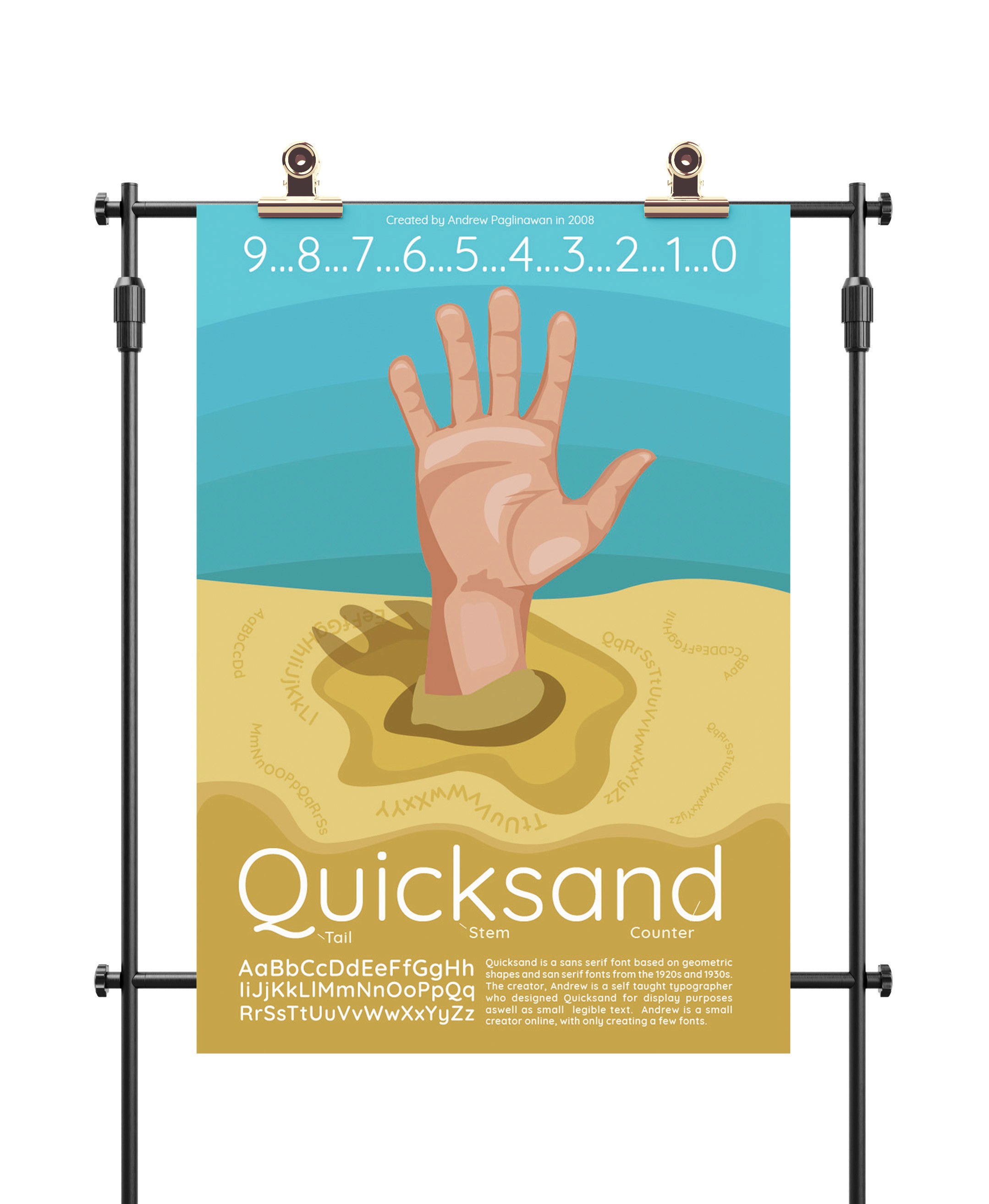 In similar fashion I started my Quicksand poster by researching and sketching. The concept was to make the poster like a movie poster instead of a classic type poster. I imagined the font as a movie and incorporated the typography within the visuals. Using calm colors and detailed and realistic illustrations, the Quicksand poster heavily contrasts my Doublebass poster.